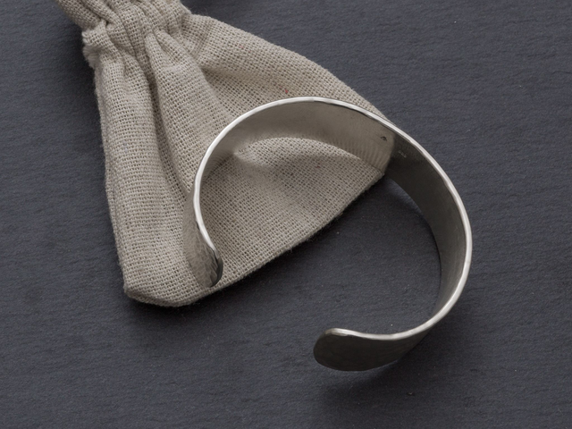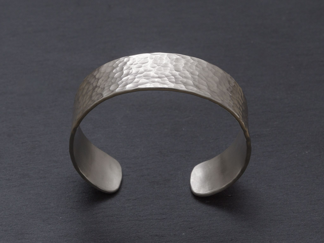 Ein breiter Armreif aus Silber mit gehämmerter Oberfläche. Bei dieser handgefertigten Armspange aus 935er Silber handelt es sich um ein hochwertiges Schmuckstück für Damen und Herren. Dieses Armband aus 935er Silber eignet sich auch hervorragend als Geschenk.