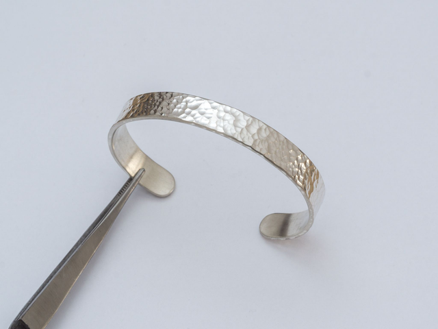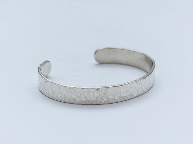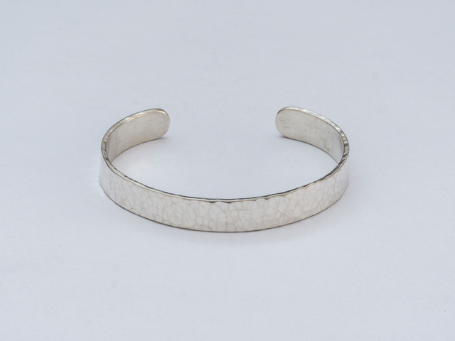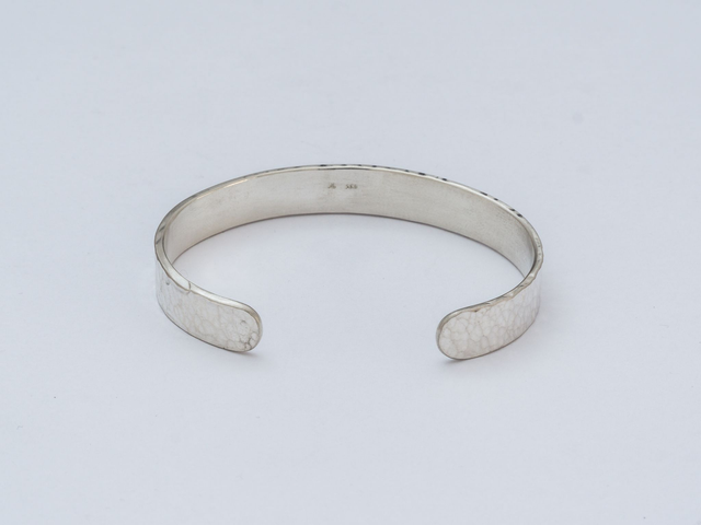 Ein Armreif aus Silber mit gehämmerter Oberfläche. Bei dieser handgefertigten Armspange aus 935er Silber handelt es sich um ein hochwertiges Schmuckstück für Damen und Herren.