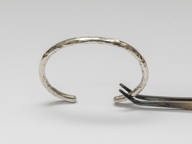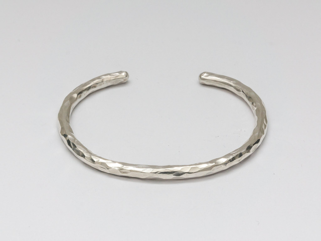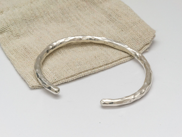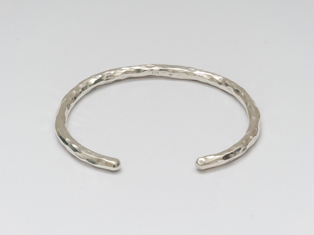 Silberarmreif mit gehämmerter Oberfläche. Dieser handgefertigte Armreif aus 935er Silber ist ein hochwertiges Schmuckstück für Damen und Herren.